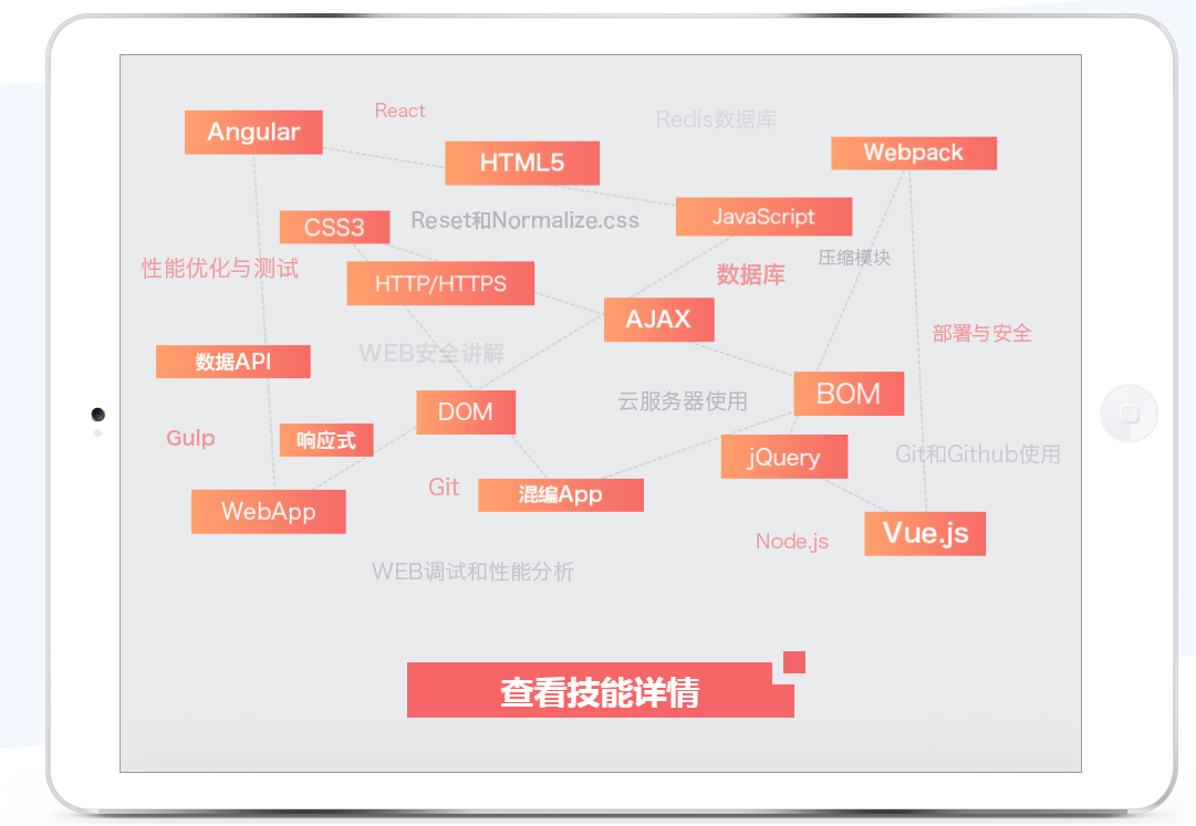 | JS、BOM&DOM、Vue.js | 降低jQuery比重,增加async/await、ES6模块规 范、原生触屏事件、TypeScript语言 | |