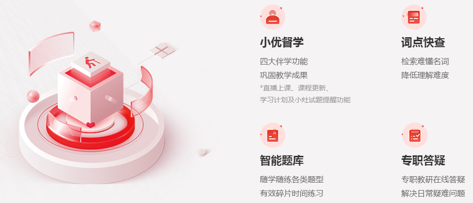线上优学班 | 基础精讲 真题训练 强化精讲 进步训练 冲刺串讲 考前点题 | 纸质邮寄: 《真题汇编与仿真训练》 《基础精讲教案》 《精炼习题强化》 电子上传: 《强化精讲教案》 《考点一本通》 《考前复习圈点》 | 1.小优督学智能学习提醒通知; 2.尊享学员专属APP题库训练; 3.专享专职教研VIP1答疑通道; 4.提供学员学术服务平台支持; 5.纸质邮寄配套学习资料包邮到家。 学习服务:两期学习服务期,当期考试不过科目下一期免学费续学,需交纳续学服务费50元/科。 | 公共单科:880 实务单科:1380 全科:3980 点击购买 |