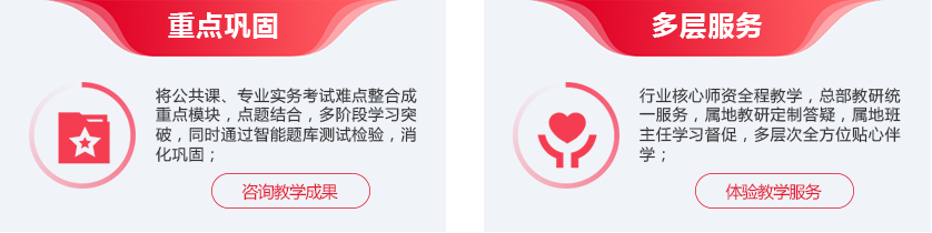 | 总裁班 | 历年真题 题库训练 标准讲义 密训试卷 总裁资料 | 教学师资: 王玲、王双增、刘宁、张凤众、王圆圆 课程时长: 160-180学时课程+11天面授 特色课程: 高清网课+题库训练+总裁专属集训 保障服务: 当年考试未过科目,可重读第二年对应课程。 | 咨询入口 |