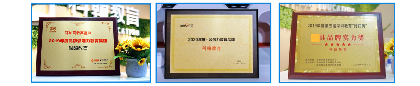 科翰先后荣获深圳教育好口碑、环球网、腾讯回响中国、CCTV央视网等多家权威媒体颁发的重要奖项