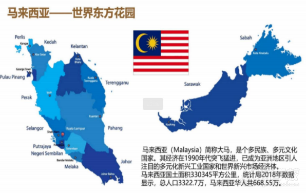 马来西亚(Malaysia)简称大马,是个多民族、多元文化国家。其经济在1990年代突飞猛进,已成为亚洲地区引人注目的多元化新兴工业国家和世界新兴市场经济体。马来西亚国土面积330345平方公里,统计局2018年数据显示,总人口3322.7万,马来西亚华人共668.55万。
