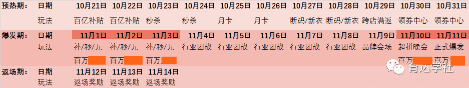 4. 所有的行业都会进行大促主题日包装,届时流量将大幅倾斜给相关类目。在11月4日-11月8日,这期间是行业团战日,商家要着力养出具有一定竞争力的链接,在行业团战日中取得好成绩。