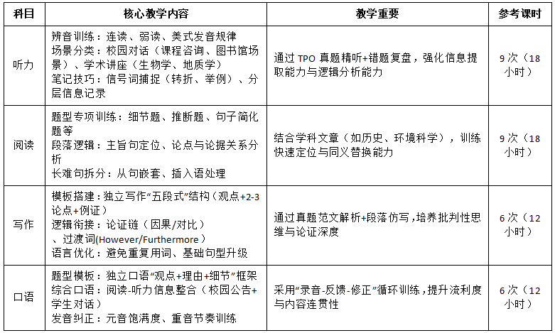 招生对象:有出国意向,入学测 60-80 分(词汇量 3500-4500,具备高中英语基础,存在听力辨音弱、阅读长难句理解难、写作逻辑不连贯等单项短板)的学生