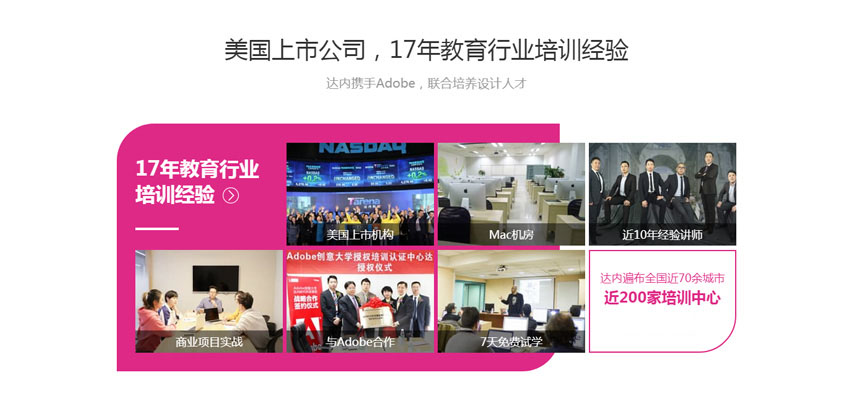| 2课程,可享受就业后再付款; | 选择的人多自然是好培训 | 学员毕业后,达内择优推荐学员就业 | 实战讲师剖析设计行业,教授符合市场需求的设计课程 | |||