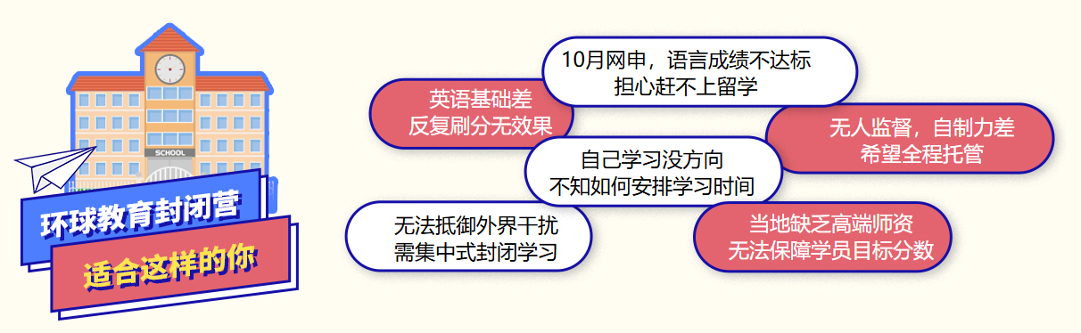 适合需要短时间内备考,摆脱雅思苦恼,希望集中精力学习,吃住学一体化式管理的学员。