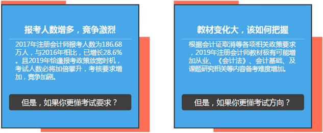 ![]() 报考条件放低会计从业停考,注册会计师报名条件取消会计证限制,门槛直接降低;只要具备教育部门认可的高校毕业以上学历即可报名2019注册会计职称考试。 了解详情 | ![]() 市场缺口变大根据《会计改革与发展“十三五”规划纲要》的文件要求,为深化改革,推动制度体系及人员结构完善,到2020年具备注册资格会计的人员需要达到500万左右。 了解详情 | ![]() 含金量增加《会计法》修订发布后会计从业取消,注册会计师很可能成为会计行业的下一个准入门槛,同时也将作为以后备考中级会计职称或注册会计师的重要跳板。 了解详情 |